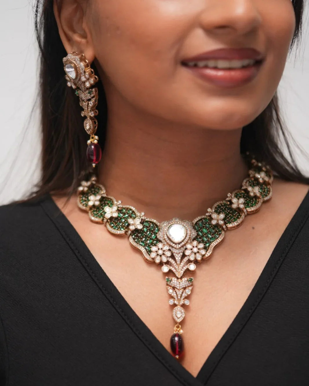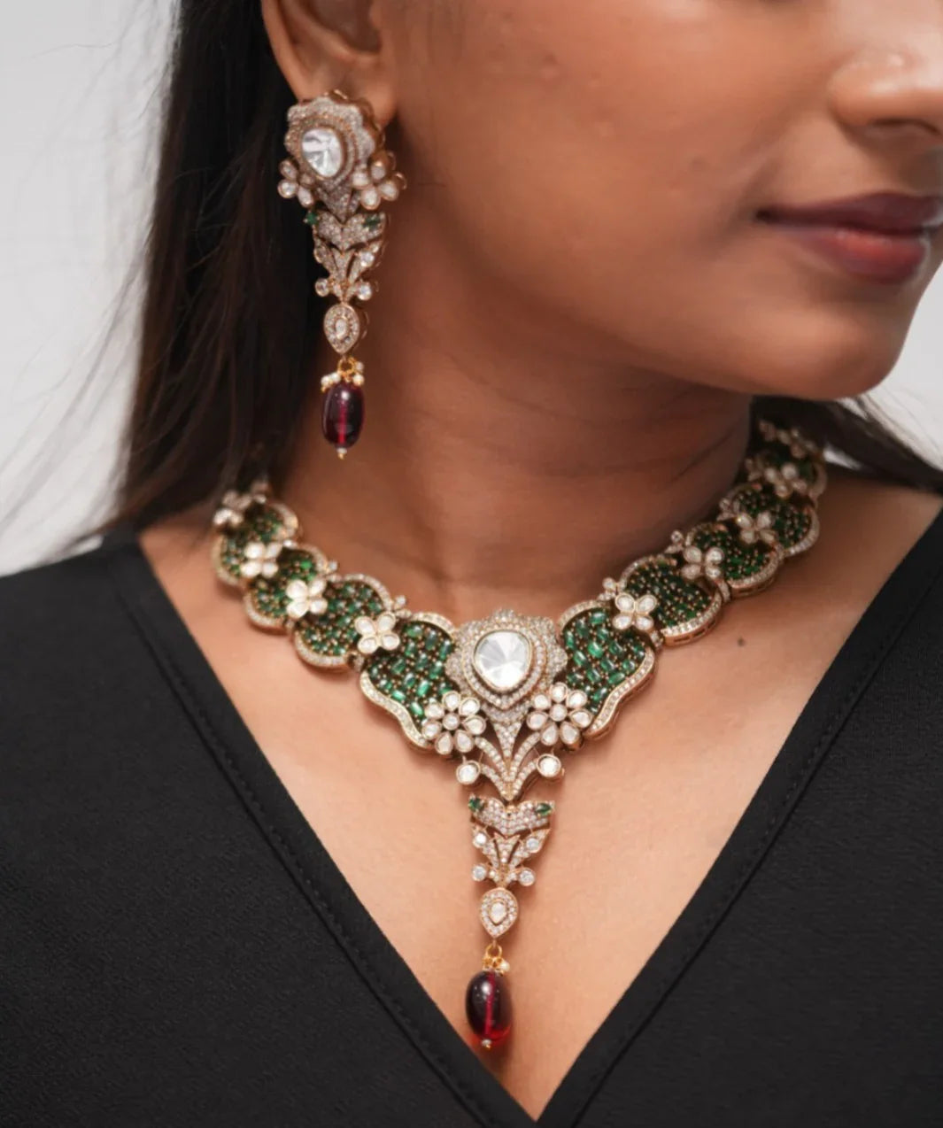 A luxurious Indian necklace and earring set featuring emerald green stones, sparkling diamonds, polki accents, and ruby drops in an intricate gold floral design. Perfect for weddings and special celebrations.
