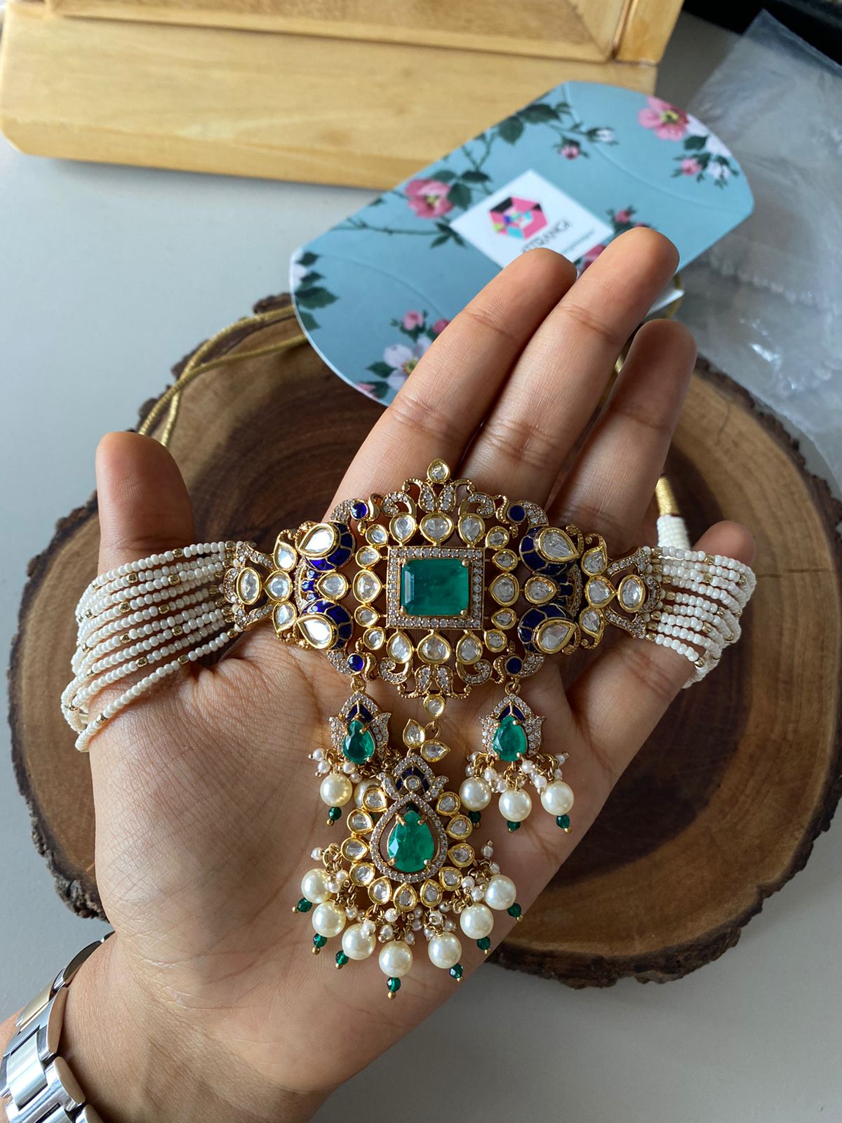 A choker set that is not too heavy but not too light either. Made with Polki Moissanite items in the highest best quality and richest looks. It has a dual colour blend that accentuates  the design.