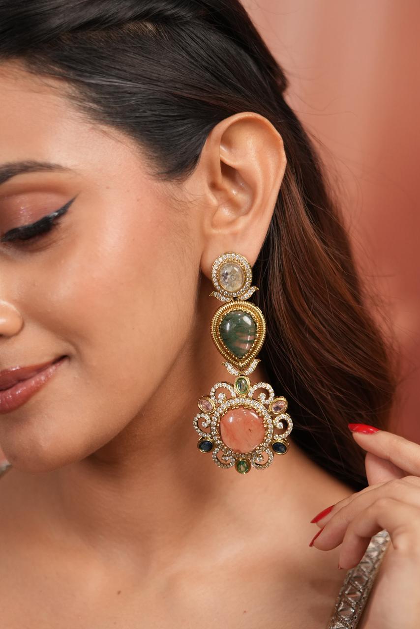 Long gemstone earrings with a colour combination of subtle orange, shaded mint and pretty grey. This multi coloured beauty is light in weight but glamorous in looks
