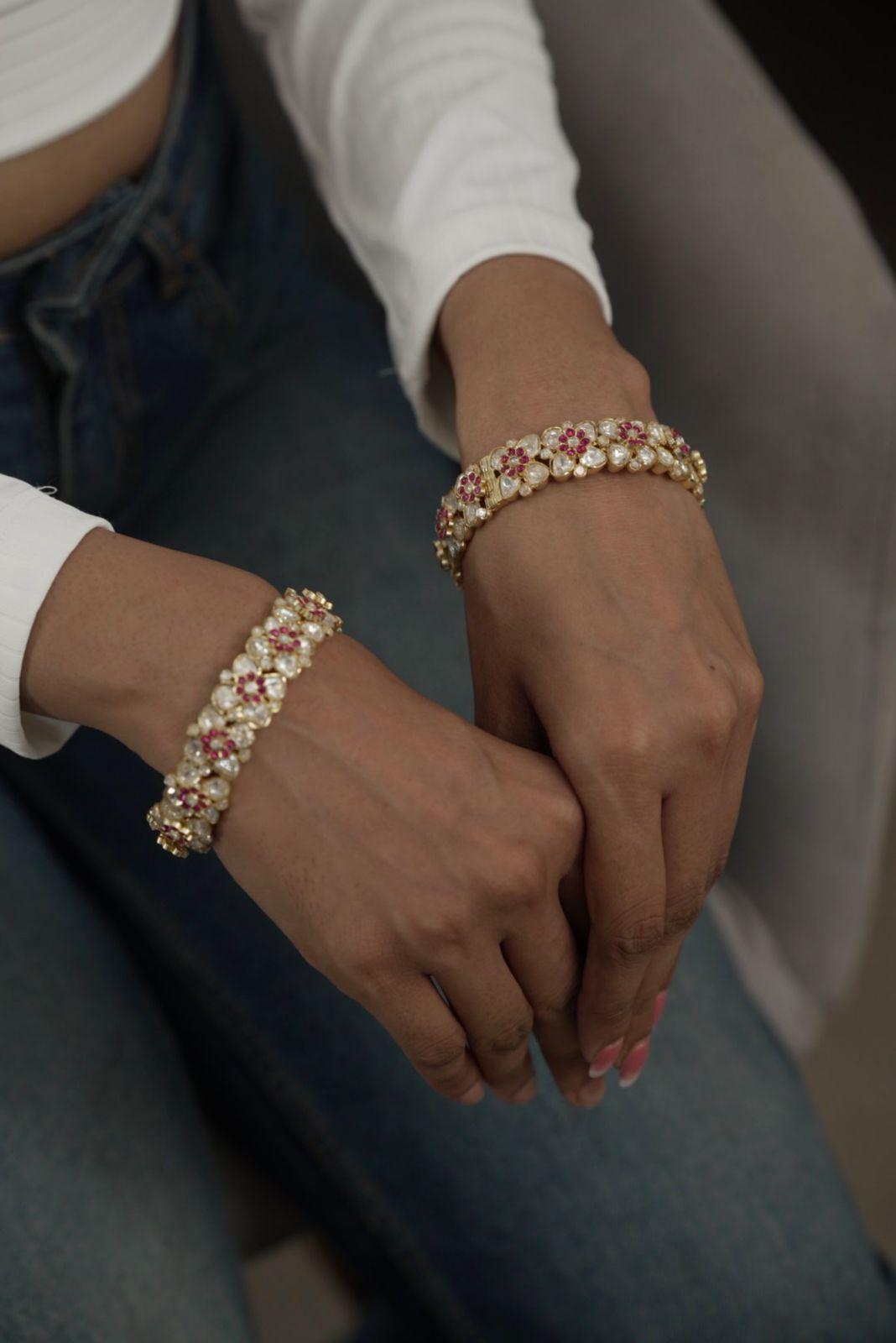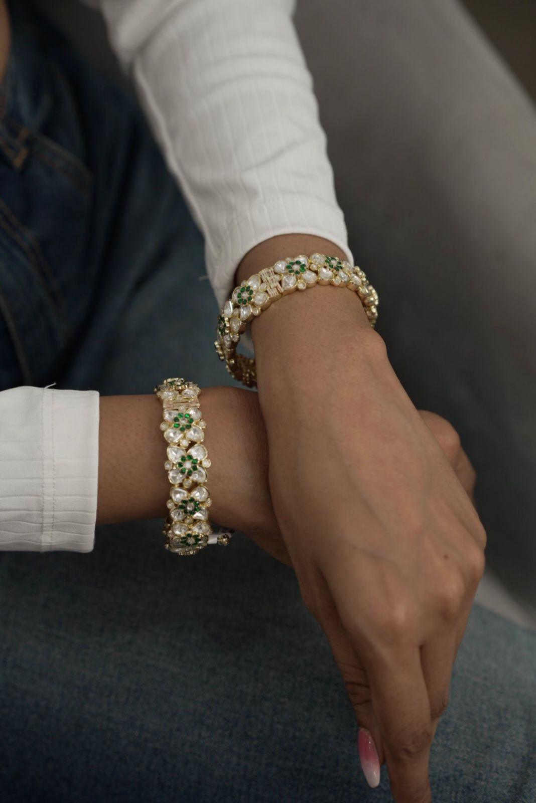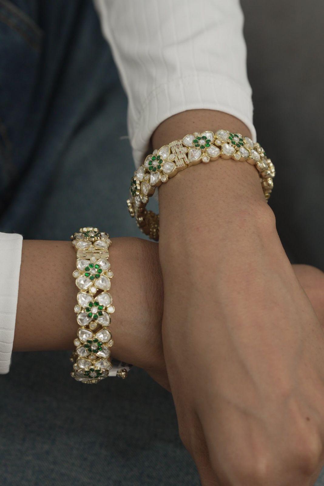 A floral Polki kada with layered 3D Moissanites over each other to give the most eccentric design. This one is so beautiful and gorgeous, it give a subtle yet bold look.