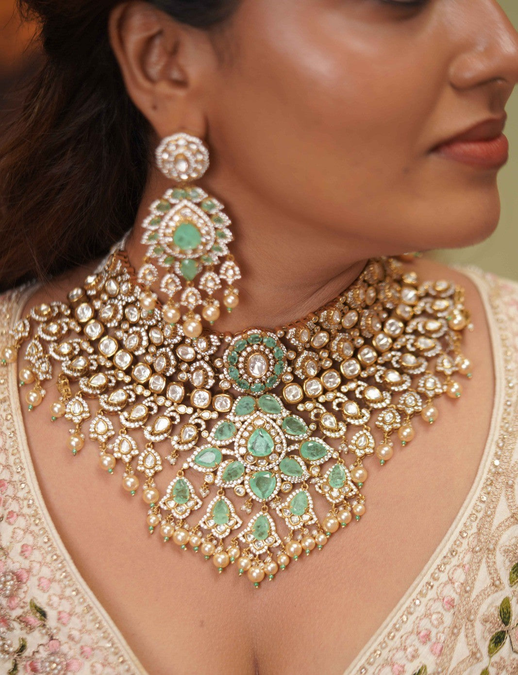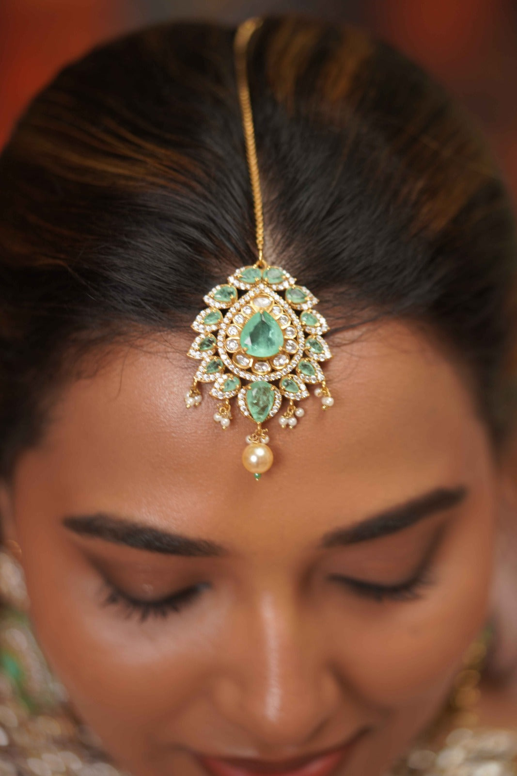 A full blown bridal choker set that has a Russian emerald center piece with floral detailing at the bottom and assembled pearls below. It comes with the most gorgeous tika that look straight out of a heritage collection.