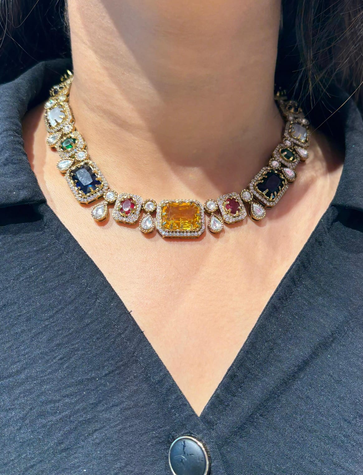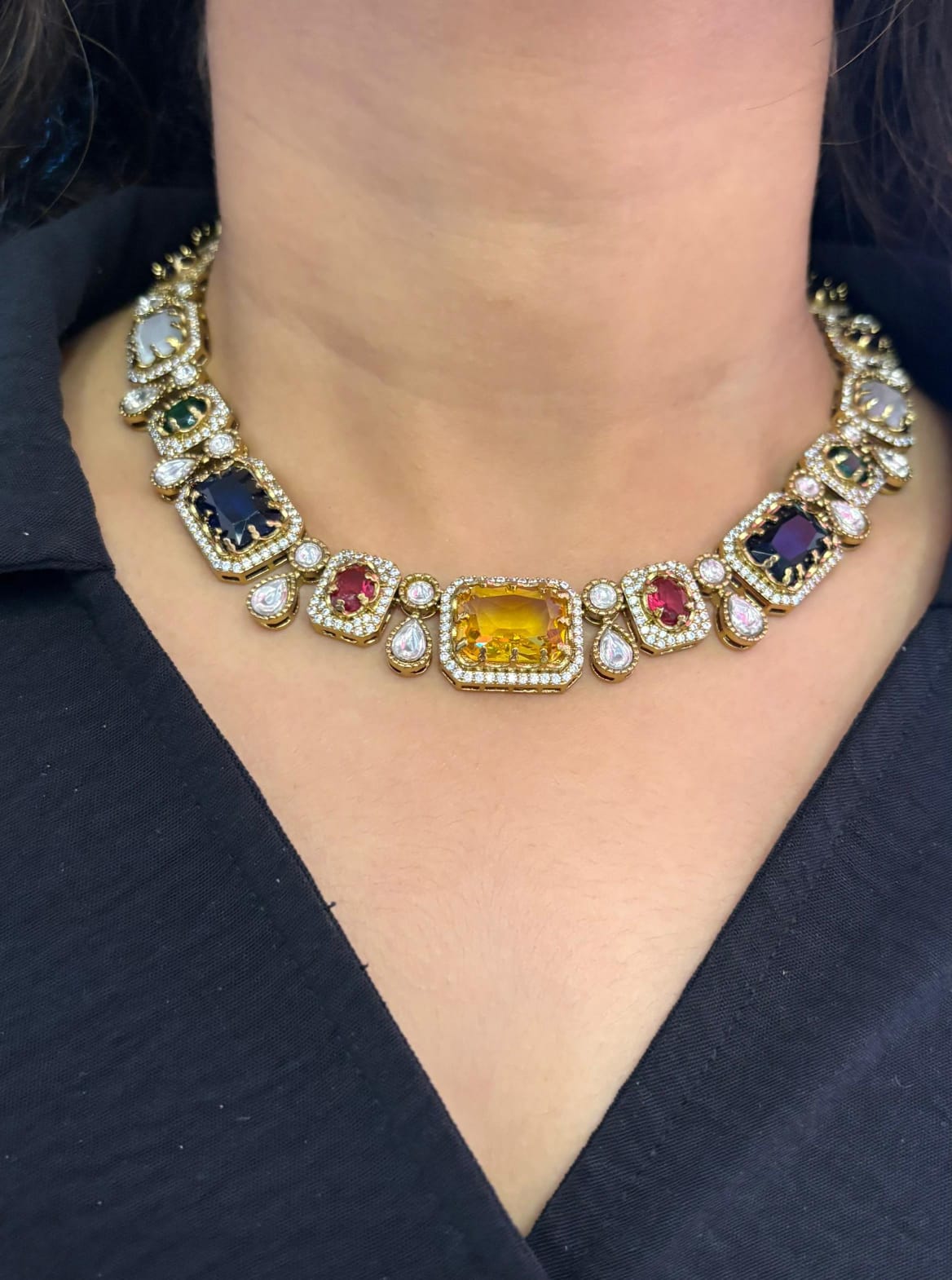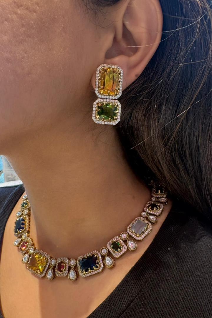A striking blend of color and craftsmanship, this set features radiant Swarovski stones in rich, multi-hued tones, each framed with delicate Polki and Mossinaite detailing in between. The bold geometric cuts paired with a classic gold finish create a perfect balance of modern elegance and timeless luxury—designed to make every look effortlessly regal.