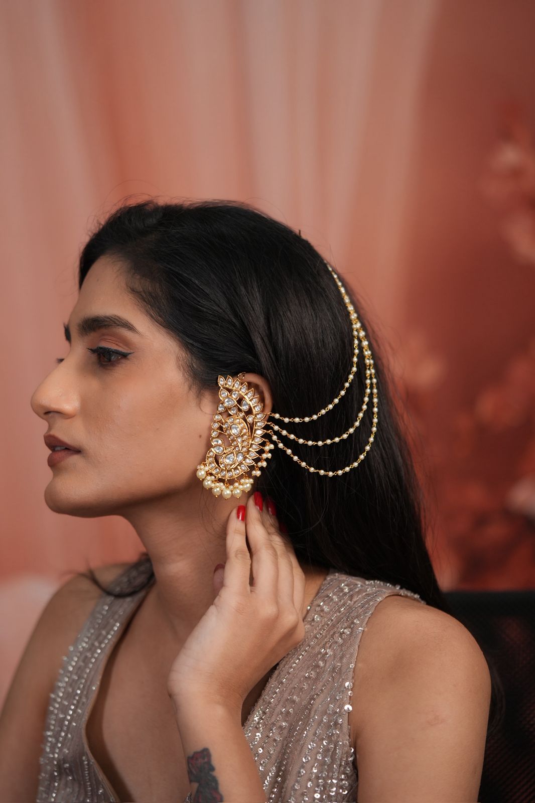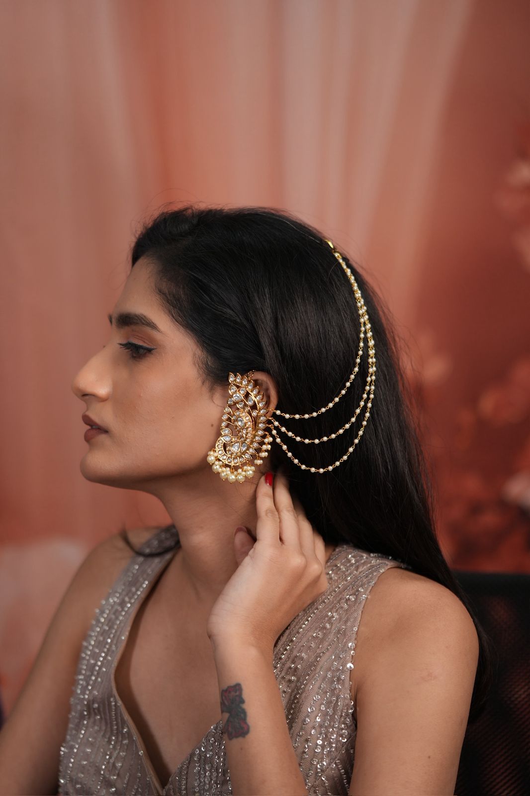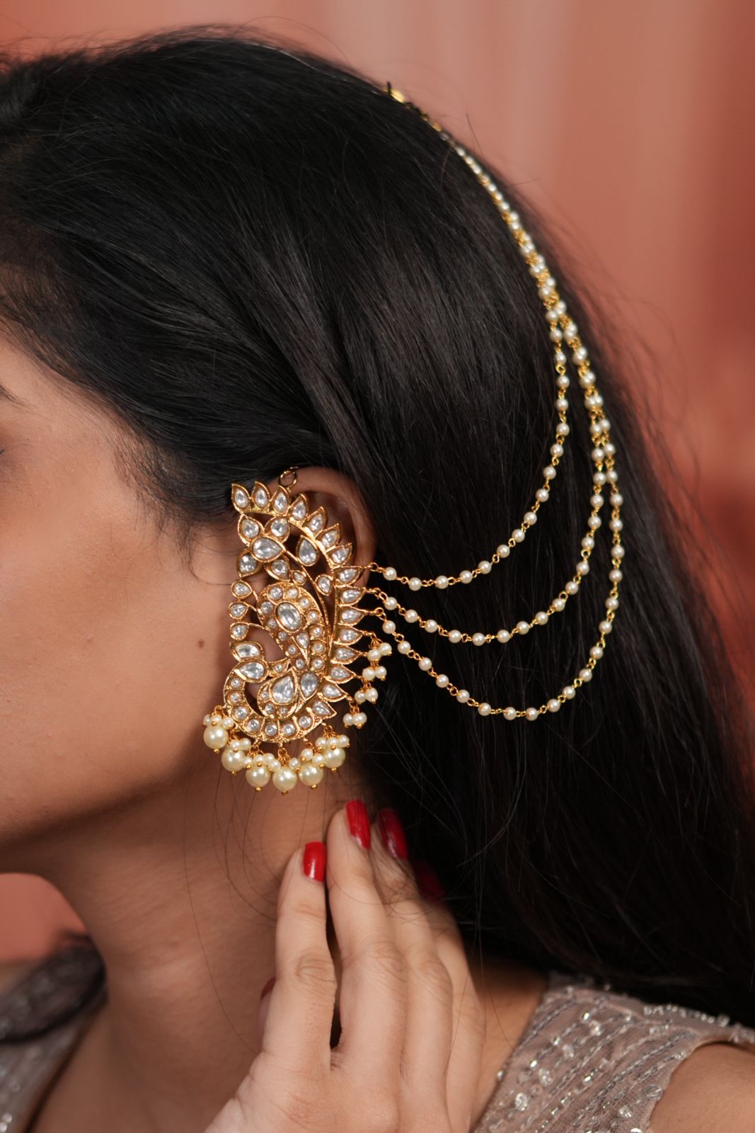 Peacock Polki Big Indian Earcuff with Attached Hair Chain, crafted in traditional bridal style. A bold statement jewellery piece featuring regal peacock motifs and timeless Indian craftsmanship.