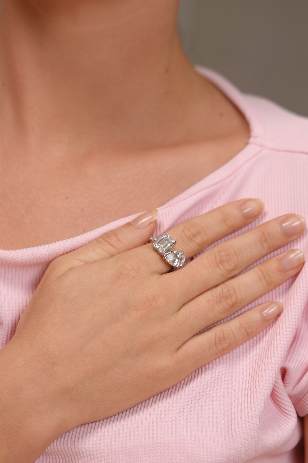 A striking Toi Et Moi design featuring a pear and emerald cut solitaire, symbolising two souls with contrasting yet perfectly balanced brilliance.