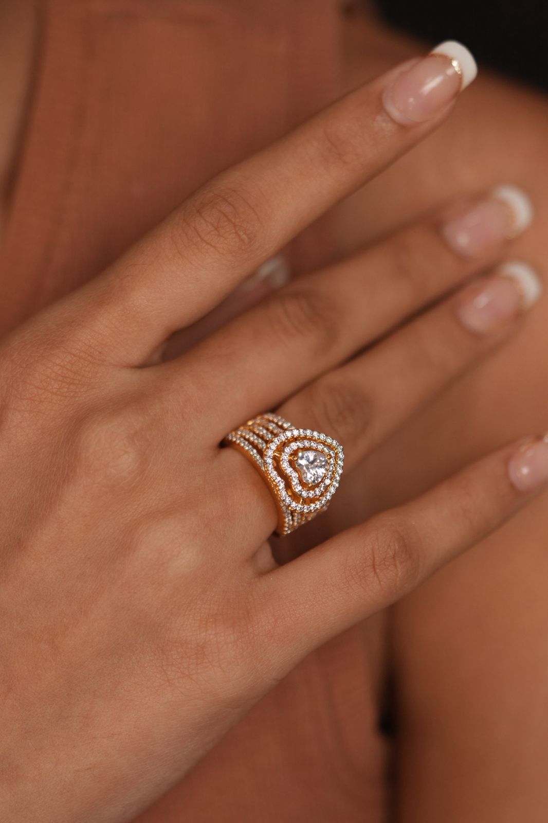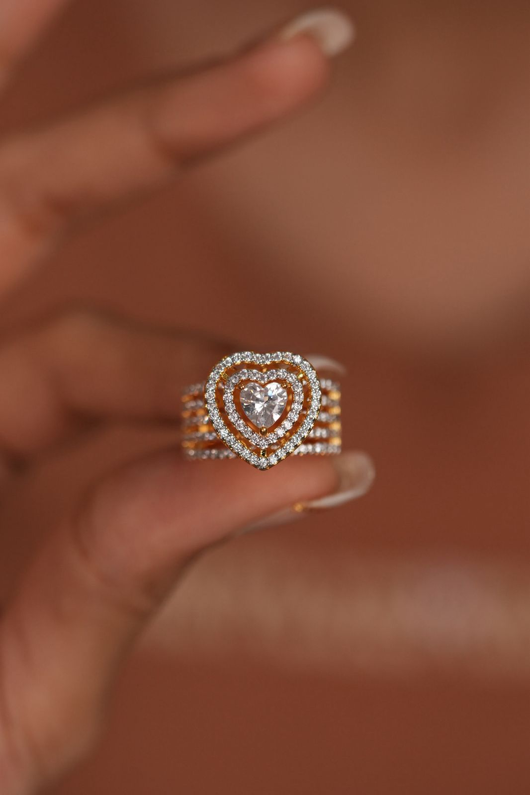 A big cocktail ring with a 90 cent heart shaped solitaire in the center and double halo around it to make it look big and chunky. This statement ring, is beautiful and attractive, and so close to the real thing!