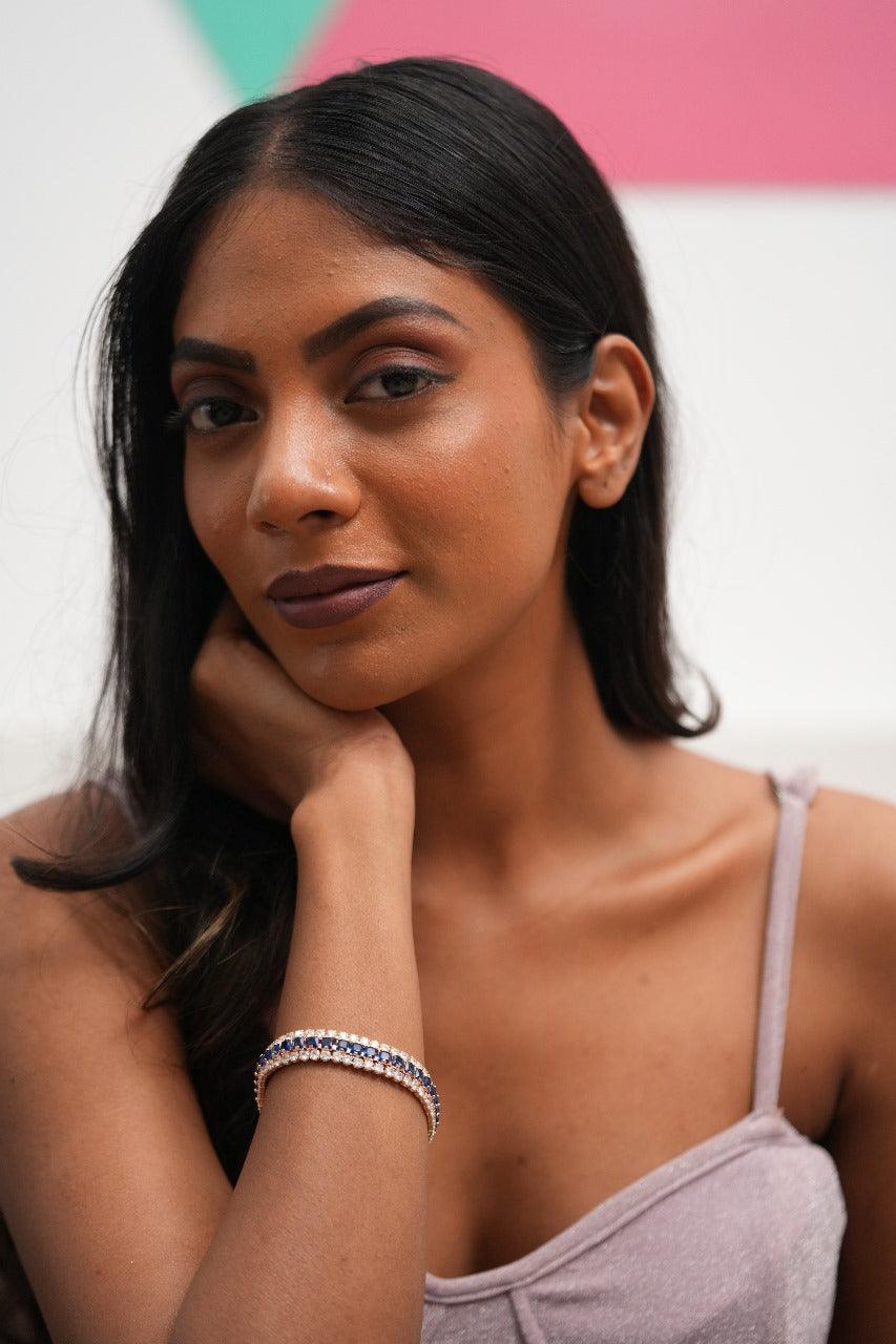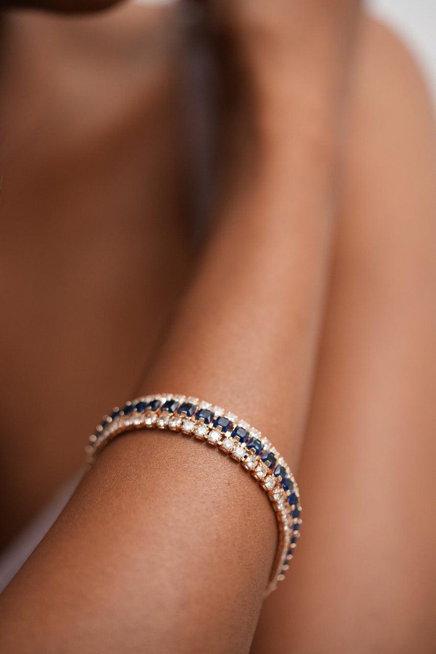 A diamond bracelet with a center line of coloured stone and a rim of diamonds around. Brightened up with gold polish at the bottom.