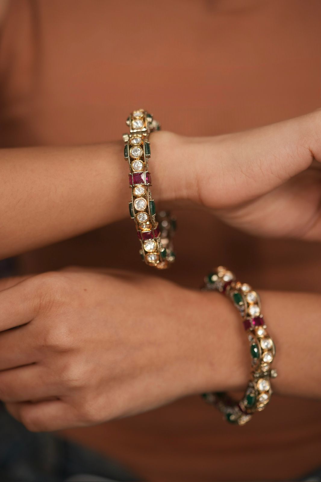 The Samohar Ruby Green Gajra Kada Pacheli showcases vibrant ruby and green stones set in a traditional moissanite-studded gajra pattern. Inspired by classic pacheli bangles, it reflects intricate craftsmanship with rich colour and heritage detailing. A regal piece that brings timeless bridal and festive elegance with a luxurious, next-to-real jewellery finish.