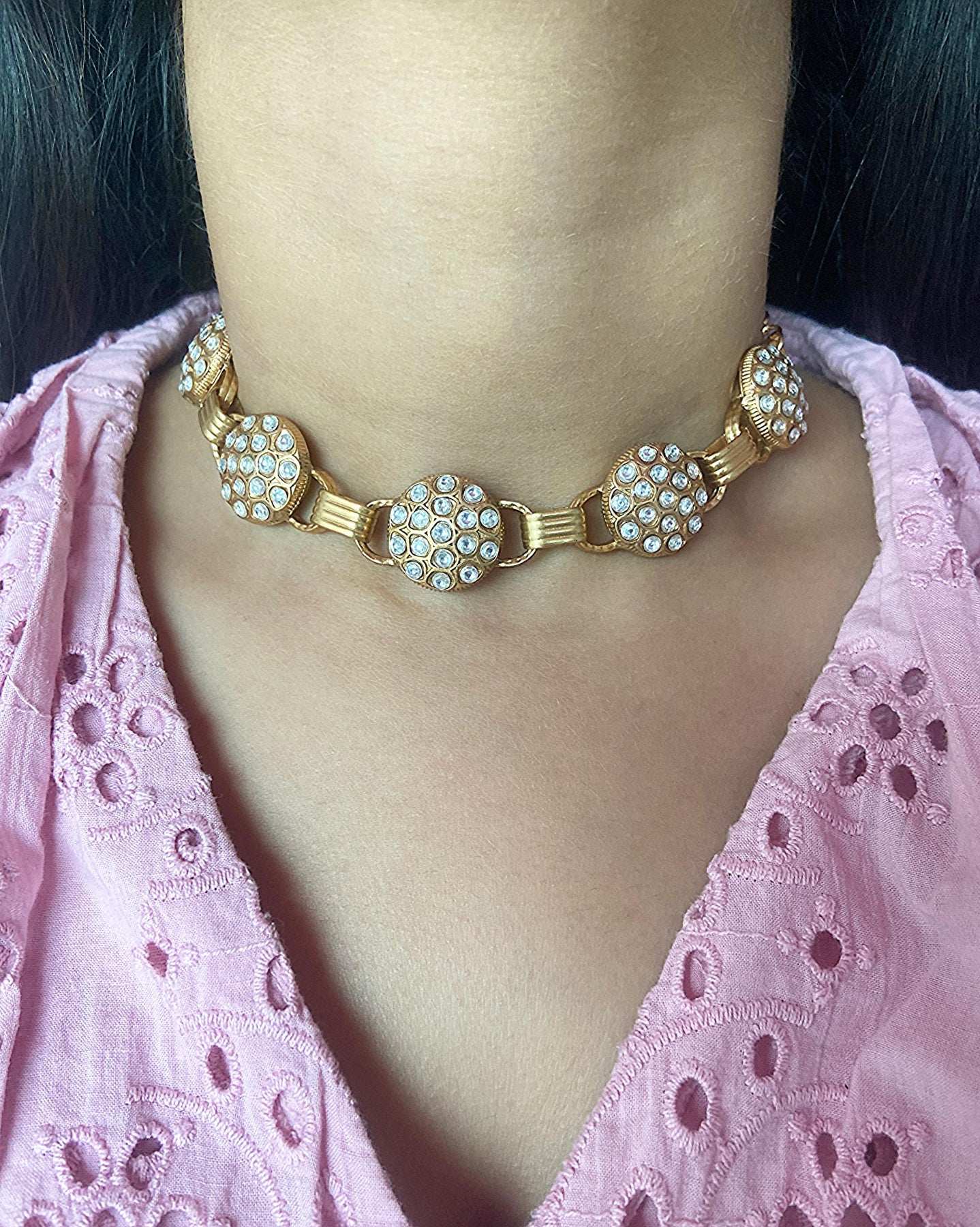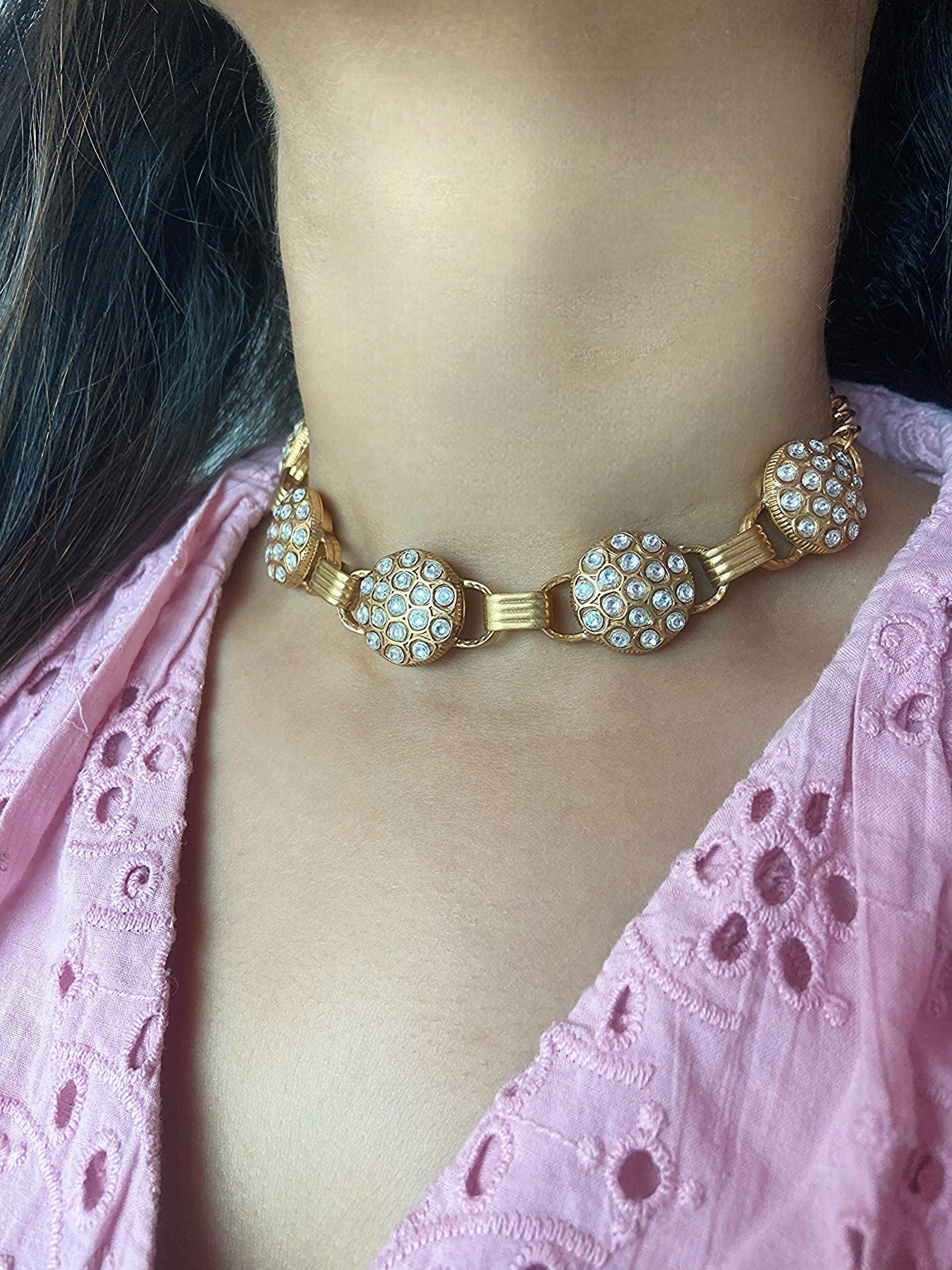 Graceful and radiant, the Shubhra Gold Choker Set features a striking arrangement of circular gold motifs encrusted with sparkling stones. Inspired by the meaning of Shubhra—pure and luminous—this choker adds effortless charm to both modern and traditional looks. A perfect pick for celebrations, weddings, or when you simply want to shine.