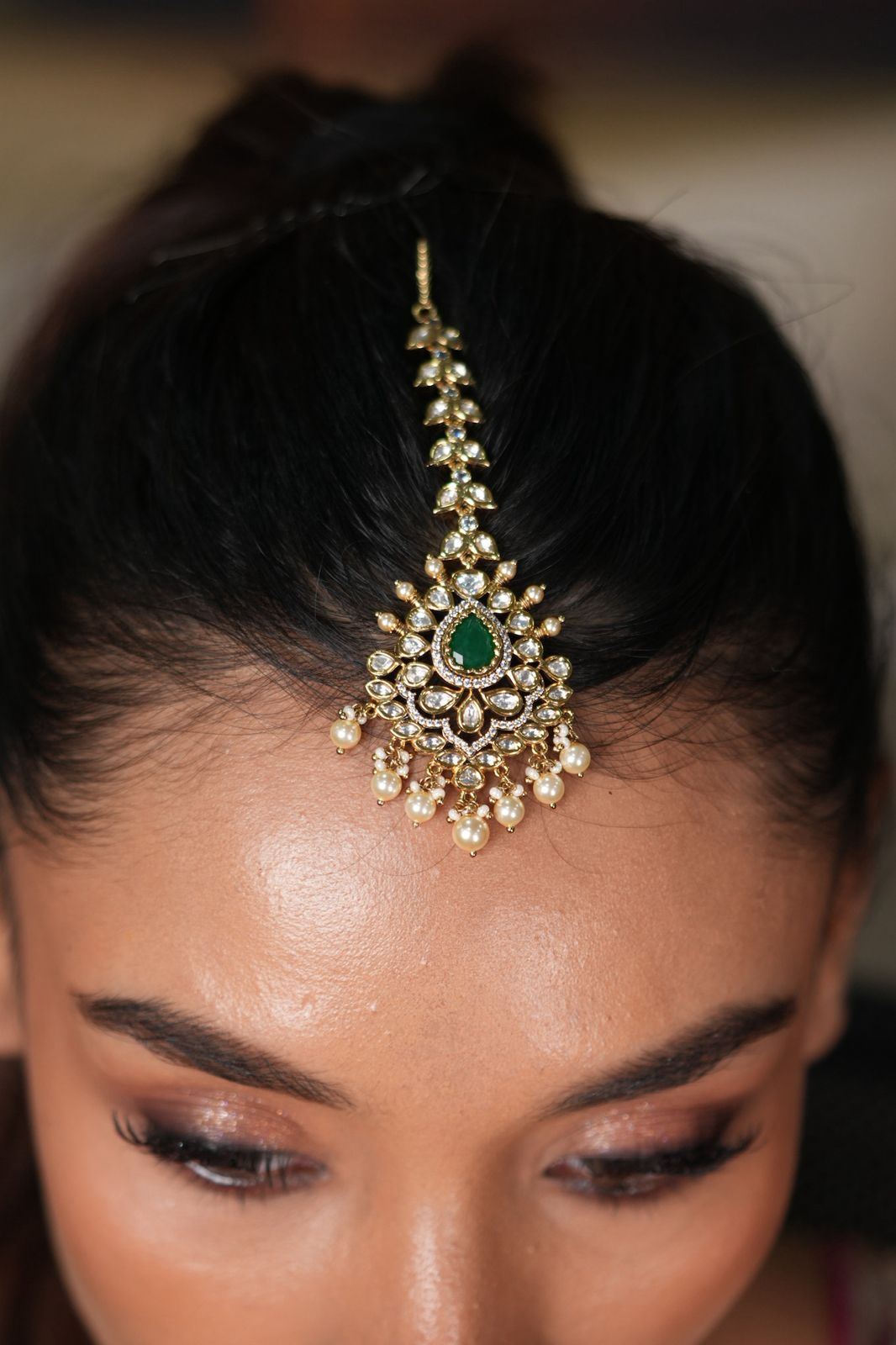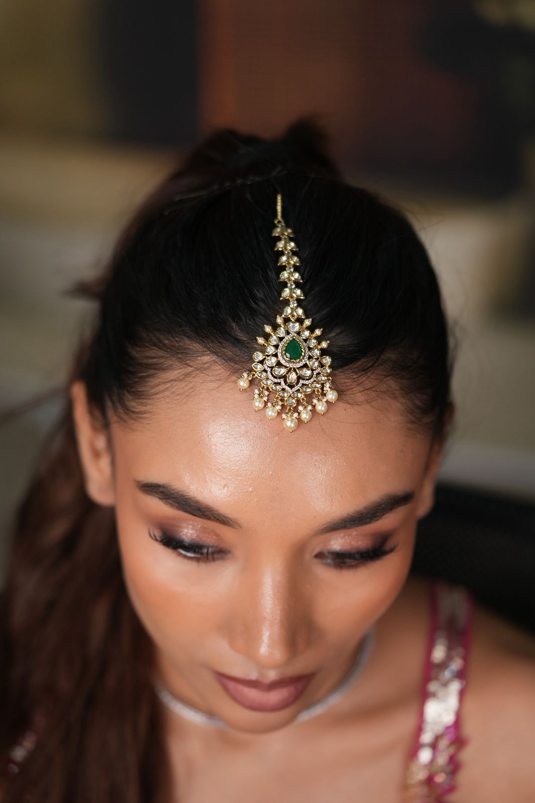 Sindhoori Moissanite Polki Maangtika — A stunning mid-sized maangtika that perfectly balances grace and grandeur. It features elegant pearl detailing on the top and a beautiful coloured stone drop at the bottom. Crafted with Moissanite Polki stones, this piece shines bright and looks effortlessly regal — simple, striking, and truly gorgeous for any festive or bridal look.