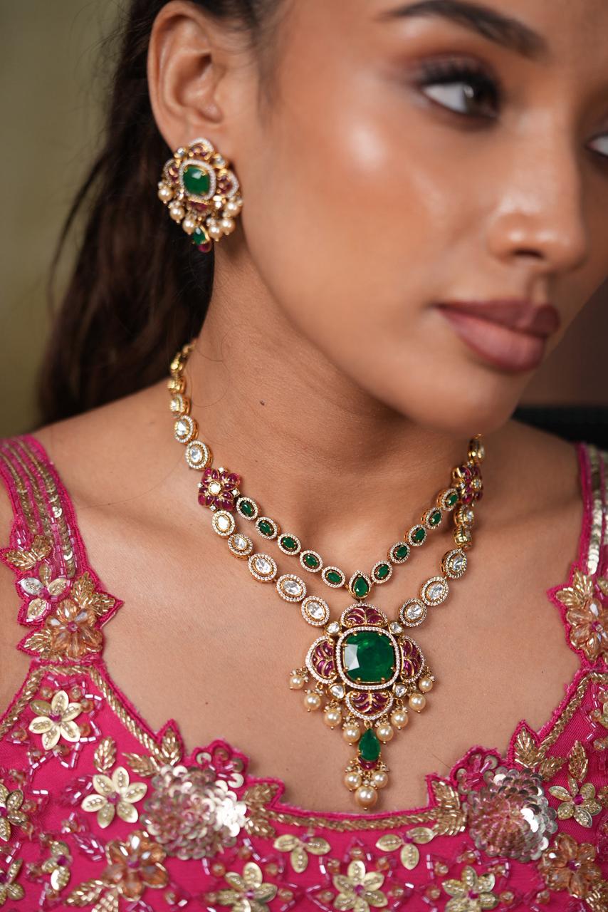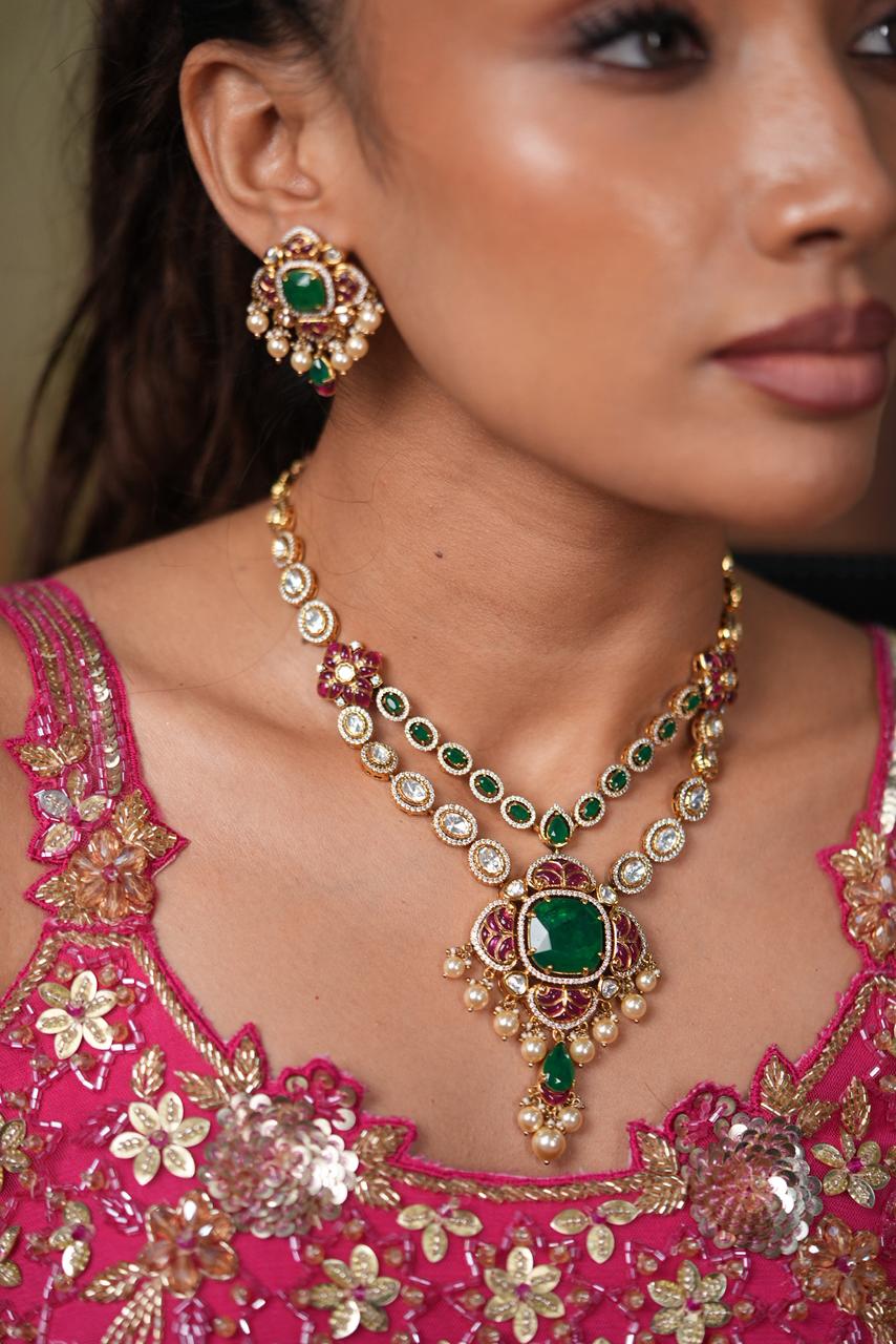 A gorgeous uncut diamond set with moissanites and a hydro emerald in the center with epoxy Meenakari detailing on the sides. The play of emerald and Ruby’s in this set, is simply splendid and luxe.