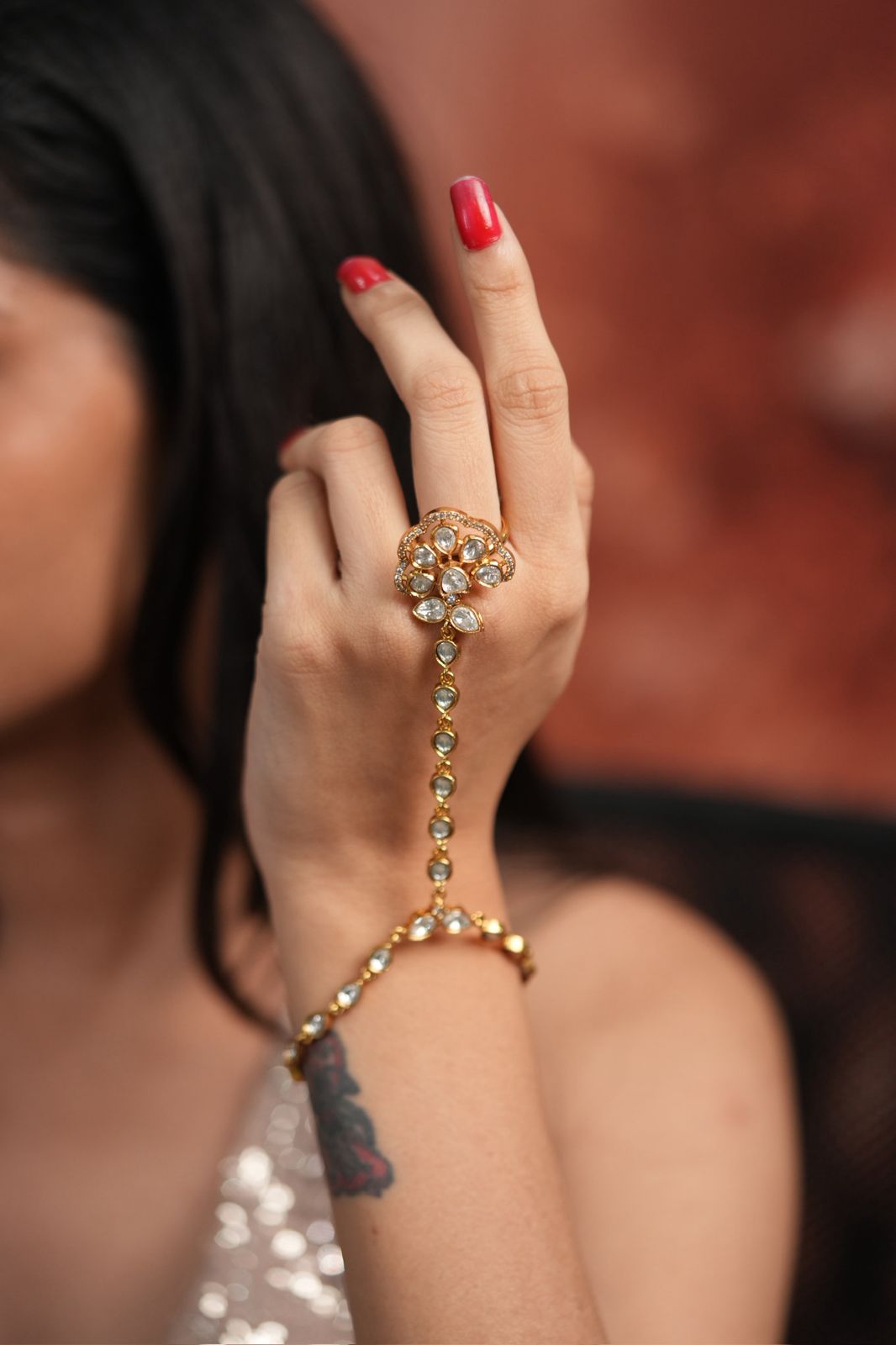 A delicate Polki hand harness with a half cut floral Polki ring in the front and assembling drops of polkis at the bottom with a delicate single line bracelet attached. We love how effortless yet stunning it looks.