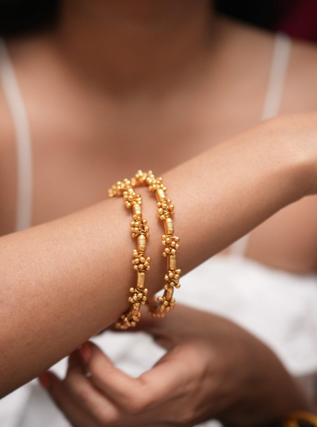 Inspired by the meaning of Varnika—“golden-hued beauty”—these bangles are crafted to echo ancestral artistry with modern finesse. The delicate floral clusters and ornate textures create a look that feels both royal and rooted.